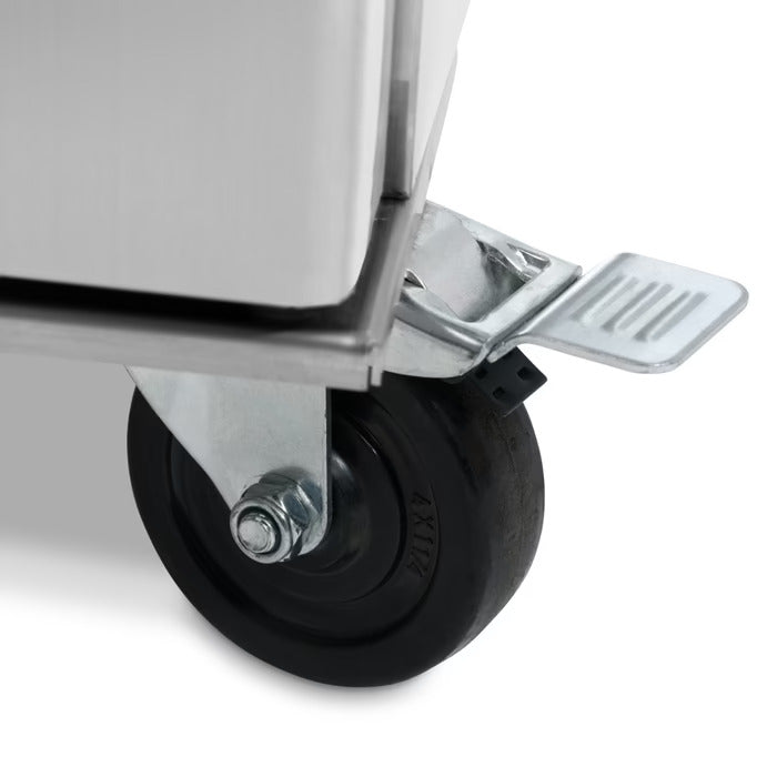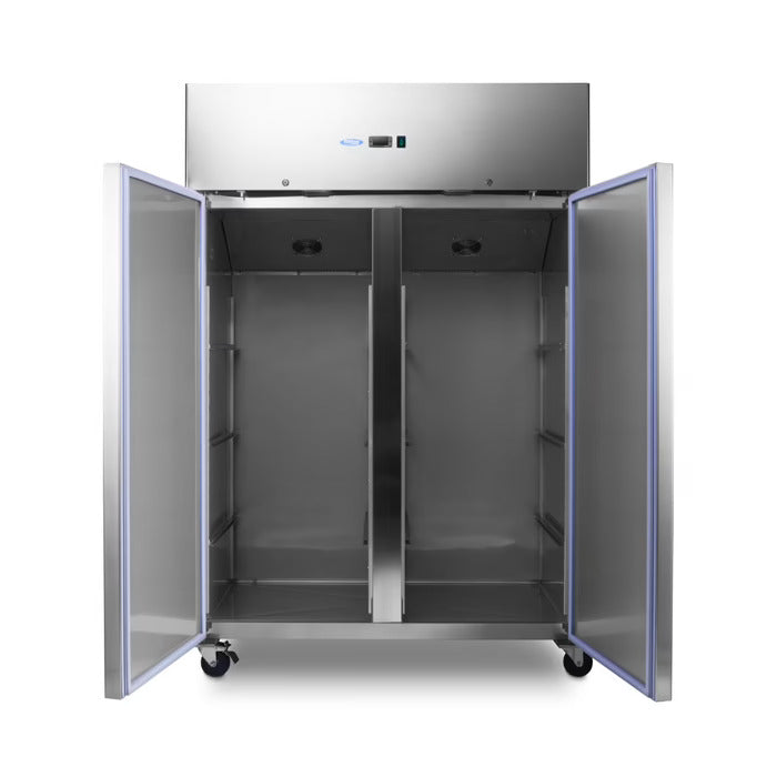 Zamrzovalnik ima dvoje robustnih vrat z magnetnim tesnjenjem vrat. To zagotavlja, da se vrata sama zaprejo. To preprečuje, da bi vrata ostala odprta in da bi se vaši izdelki odmrznili. Vrata lahko posamično zaklenete s ključem. Nad vrati lahko natančno odčitate temperaturo in jo nastavite s smernimi tipkami. Temperaturo zamrzovalnika lahko nastavite od -10 do -20 °C. Ko odprete ali zaprete vrata, se lučka na vratih samodejno prižge ali ugasne. Čeprav gre za velik zamrzovalnik, ga je s štirimi kolesi pod njim enostavno premikati. Sprednja kolesa so opremljena z zavoro, ki zamrzovalnik ohranja na mestu.