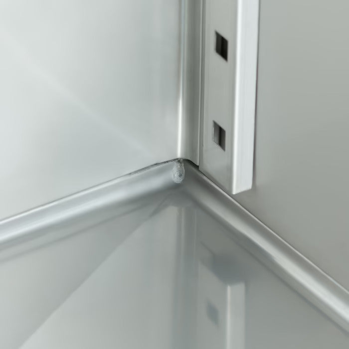 Za vsakimi vrati ima zamrzovalnik tri rešetke z ustreznimi vodili. Rešetke lahko nastavite v višini približno 5 cm. To vam omogoča, da zamrzovalnik razporedite po svojih željah. Bi v zamrzovalniku želeli več nivojev? To lahko storite tako, da na naši spletni strani naročite dodatne rešetke z vodili. Mrežice imajo na zadnji strani dvignjen rob, ki preprečuje, da bi izdelki padli za mrežico ali zamrznili ob zadnji steni zamrzovalnika.